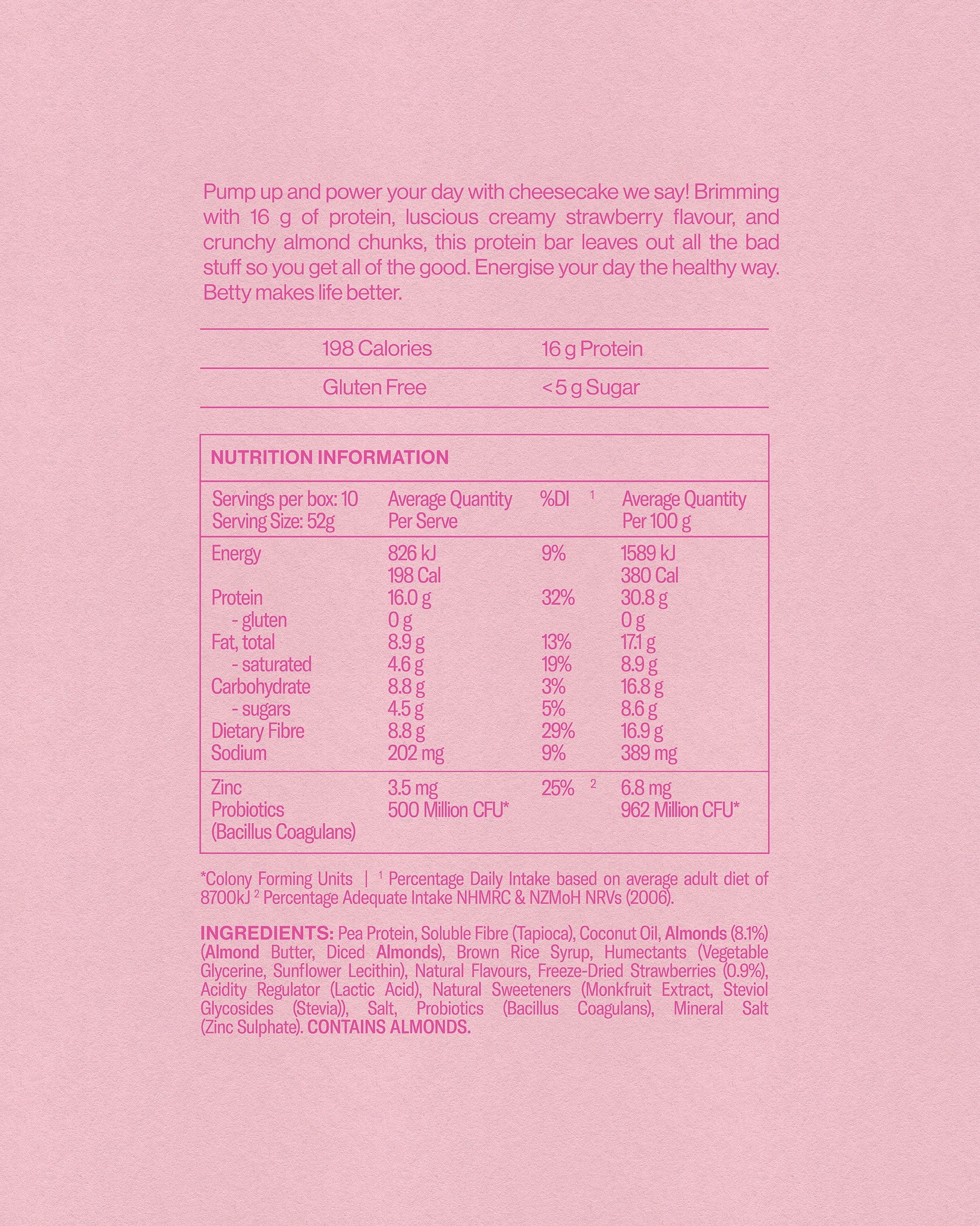 Strawberry Cheesecake: Strawberry Cheesecake Betty Bar packs 16 grams of protein per serve, is an excellent source of fibre, good source of zinc, and contains 500 million CFU (colony forming units) of probiotics for gut health.