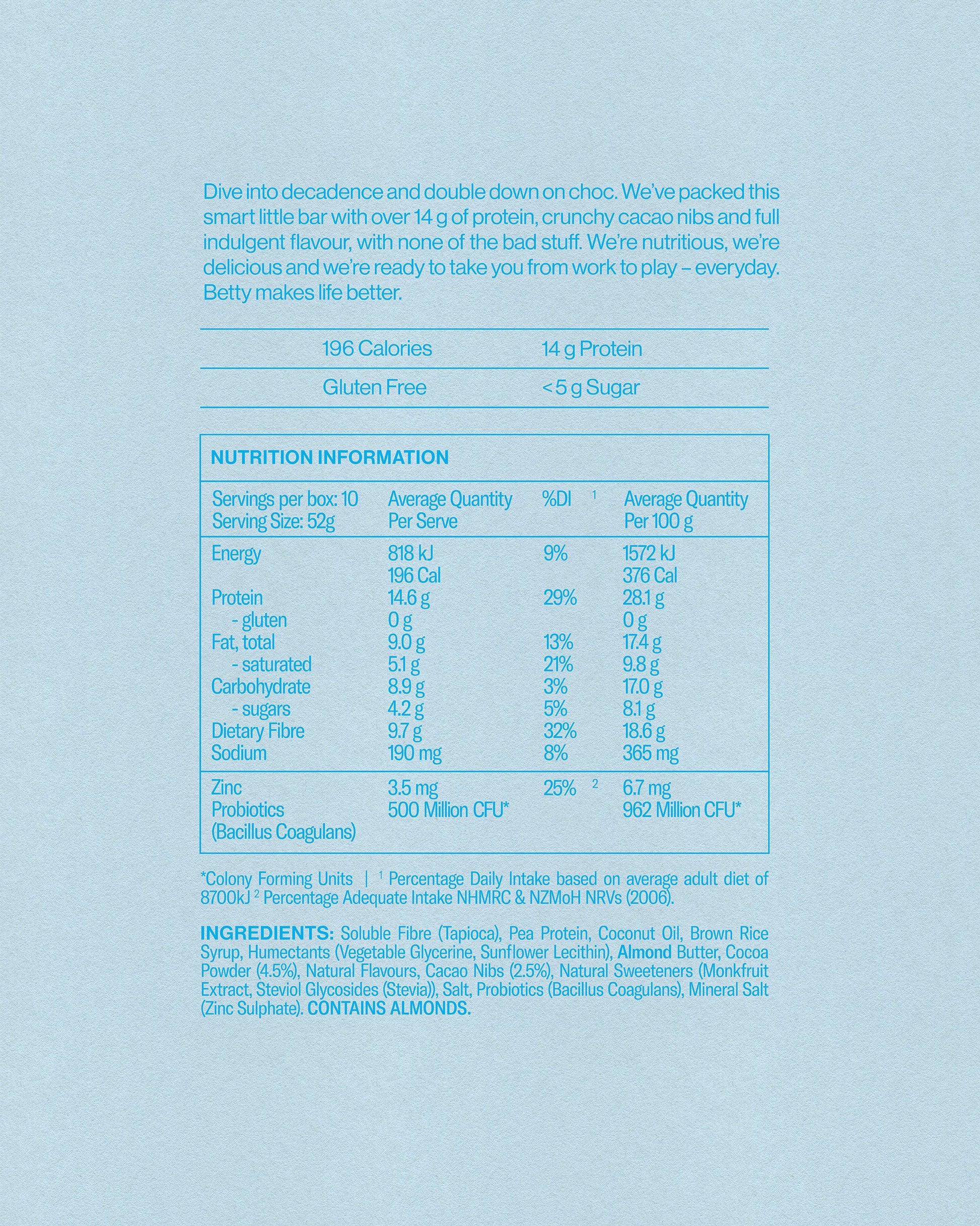 Chocolate Fudge: This nutritionally powerful protein bar is like no other. Boasting 100% natural ingredients, Chocolate Fudge & Cacao Nib Betty Bar packs 14.6 grams of protein per serve, is an excellent source of fibre, good source of zinc, and contains 500 million CFU (colony forming units) of probiotics for gut health.