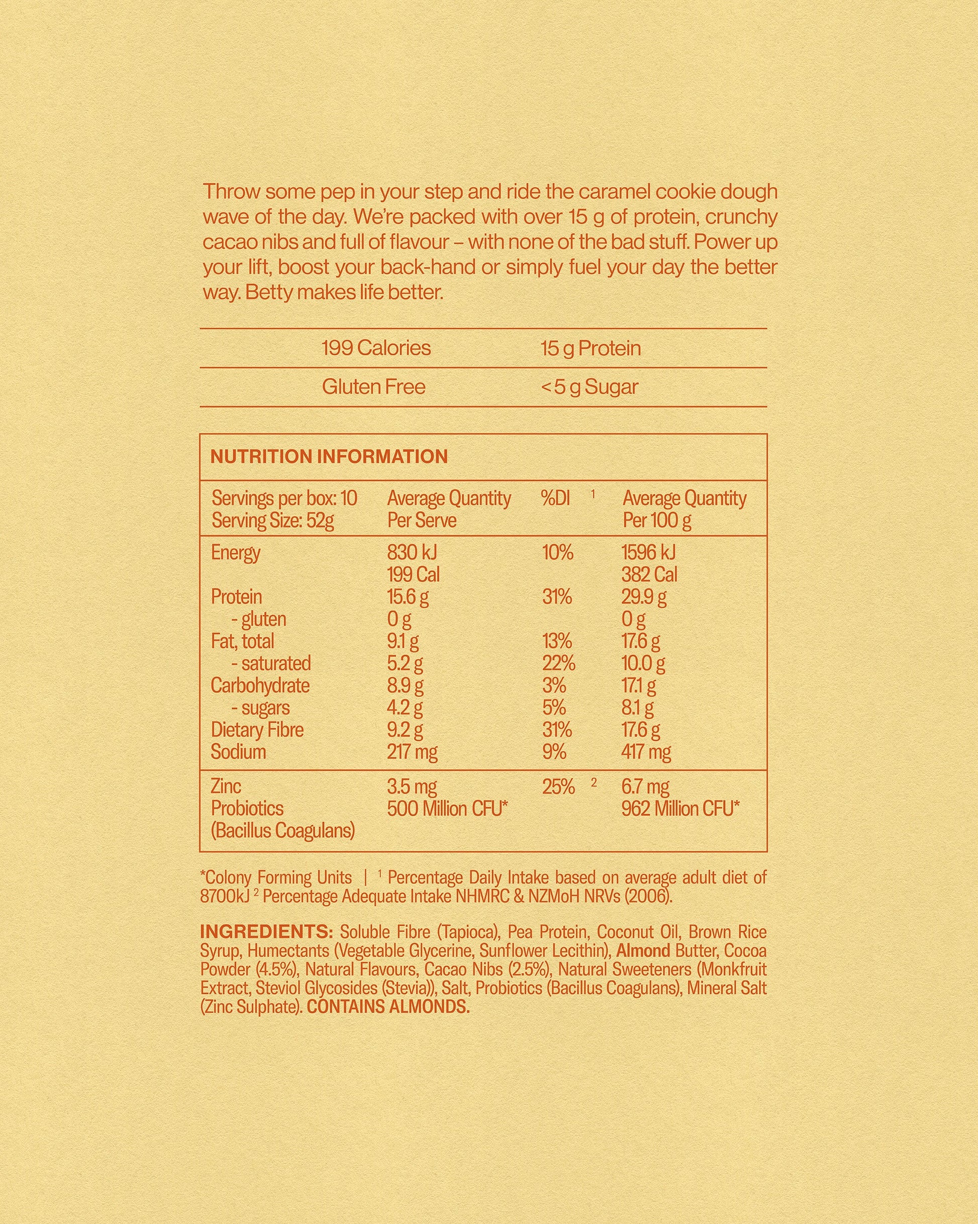 Caramel Cookie: This nutritionally powerful protein bar is like no other. Boasting all natural ingredients, Caramel Cookie Dough Betty Bar packs 15.6 grams of protein per serve, is an excellent source of fibre, good source of zinc, and contains 500 million CFU (colony forming units) of probiotics for gut health.