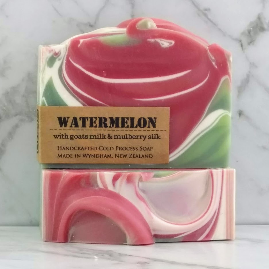 Ingredients: Rice Bran Oil, NZ Goat Milk, Coconut oil (Pacific region), RSPO Palm Oil, Sodium Hydroxide (is used to turn oils into soap and glycerin – it does not exist in the final bar), Shea butter (collected by a co-operative of women in Africa, fair trade certified), fragrance (IFRA compliant, phthalate-free fragrances, USA origin), Mulberry silk fibre, Mineral Mica (colour), Titanium Dioxide (white colour)