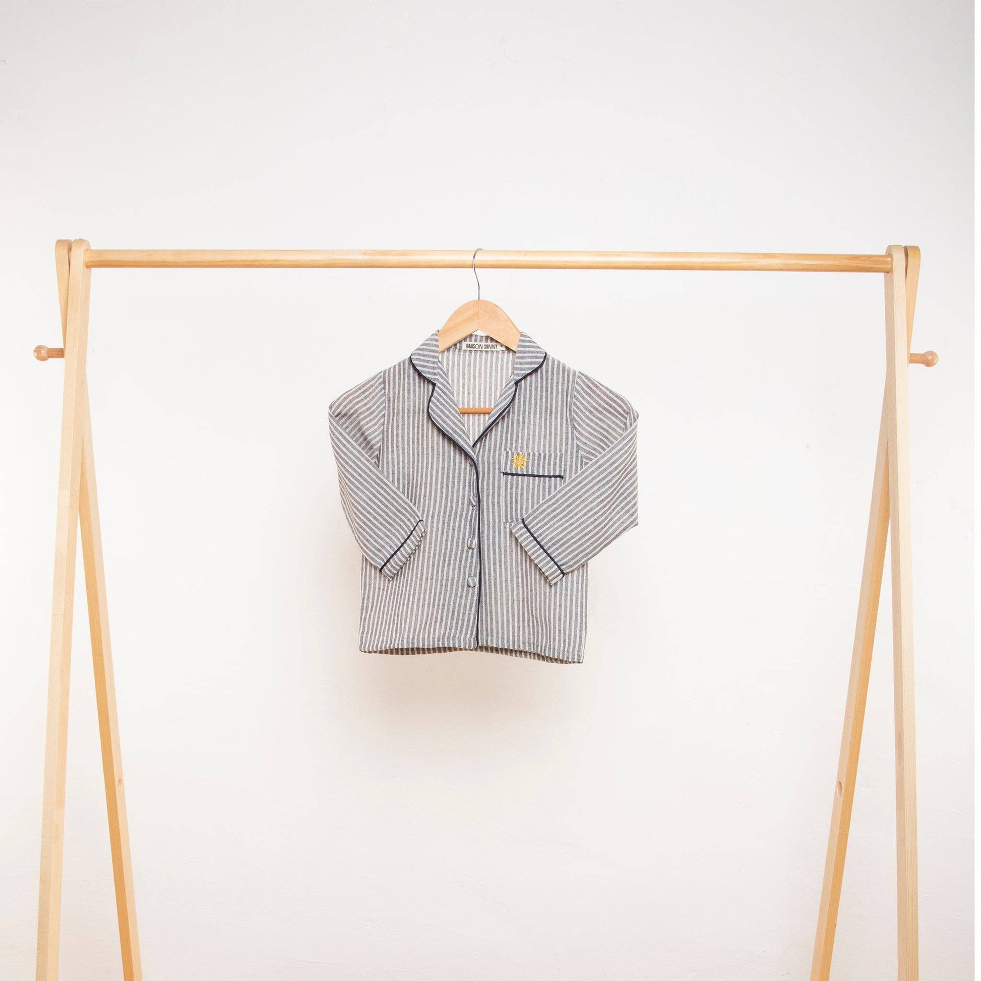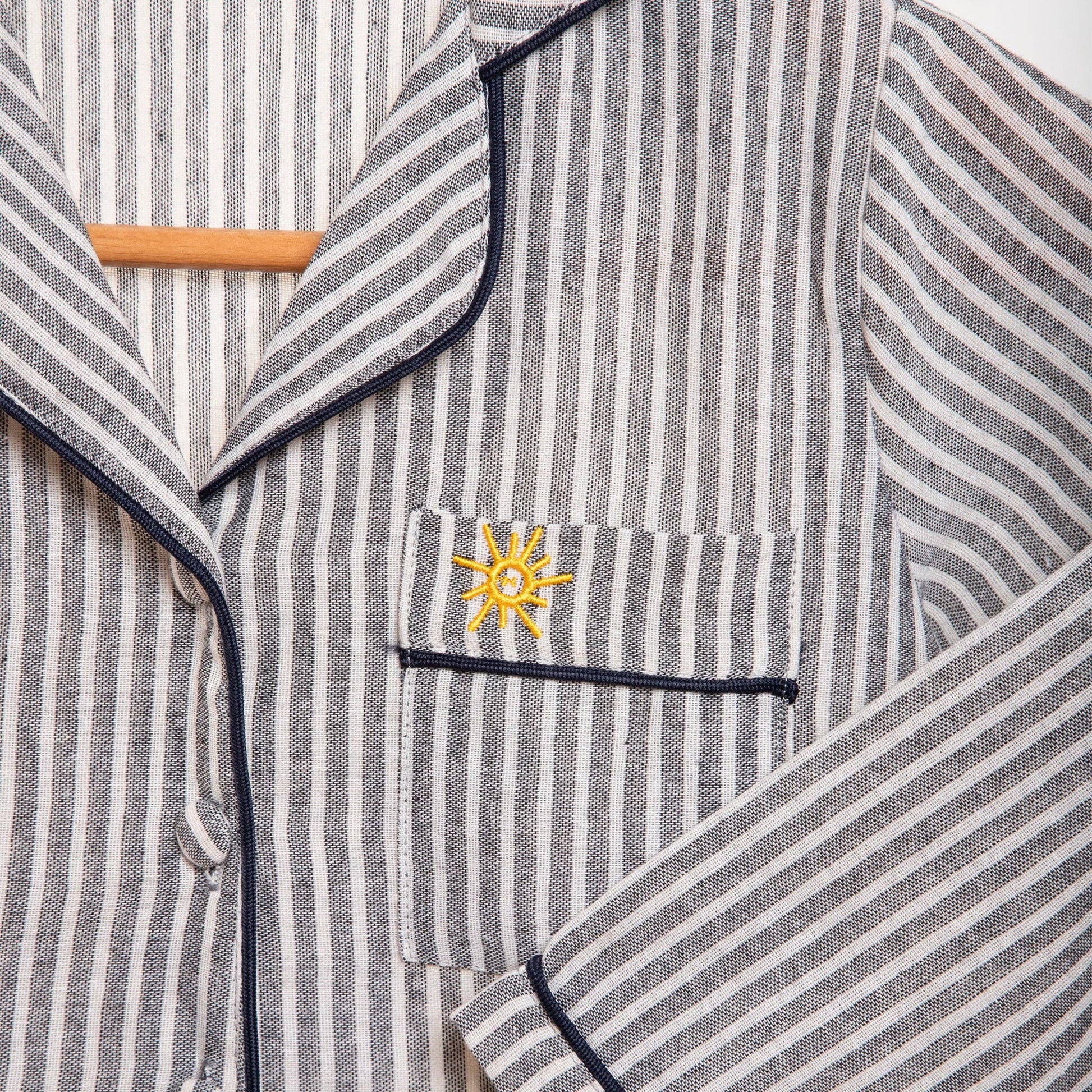 Maison Sunny's classic and timeliness children's pyjama set is the perfect gift or addition to any wardrobe. Handmade from natural linen fabric that softens with every wash, this is our Spencer kids linen black and white striped linen with yellow logo detail pyjama set.